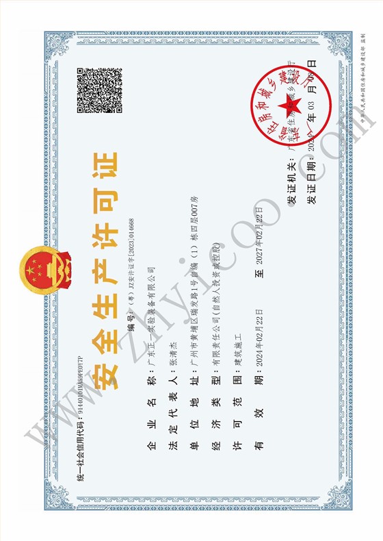 广东正一实验装备有限公司已获得安全生产许可证,证明公司在各类工程项目中始终严格遵循安全生产的各项标准,确保工地及作业人员的安全。
